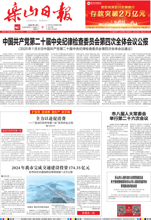 中国共产党第二十届中央纪律检查委员会第四次全体会议公报 全力以赴促消费 2024 年我市完成交通建设投资174.35 亿元 市八届人大常委会举行第二十六次会议 乐山市人民代表大会常务委员会关于接受赖俊辞去乐山市人民政府副市长职务的请求的决定