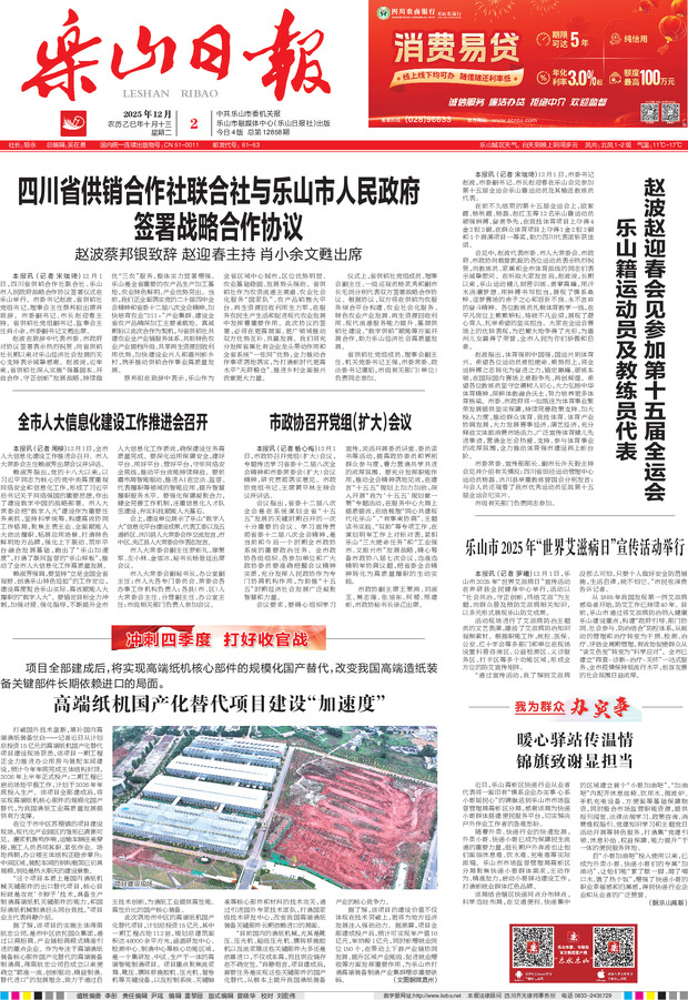 四川省供销合作社联合社与乐山市人民政府签署战略合作协议 赵波赵迎春会见参加第十五届全运会 乐山籍运动员及教练员代表 全市人大信息化建设工作推进会召开 市政协召开党组(扩大)会议 乐山市2025年“世界艾滋病日”宣传活动举行 高端纸机国产化替代项目建设“加速度” 暖心驿站传温情 锦旗致谢显担当