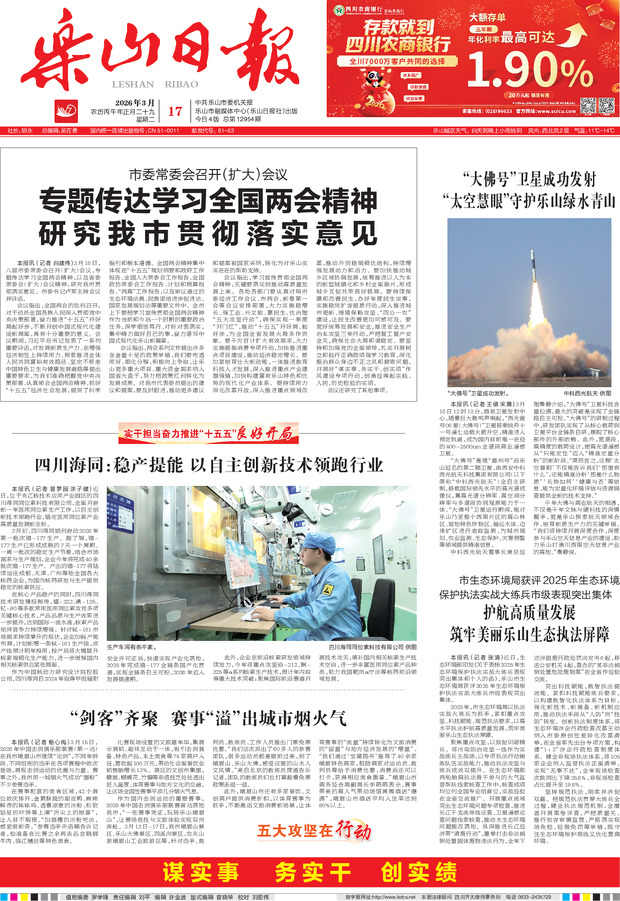 专题传达学习全国两会精神 研究我市贯彻落实意见 “大佛号”卫星成功发射 “太空慧眼”守护乐山绿水青山 四川海同:稳产提能 以自主创新技术领跑行业 护航高质量发展 筑牢美丽乐山生态执法屏障 “剑客”齐聚 赛事“溢”出城市烟火气