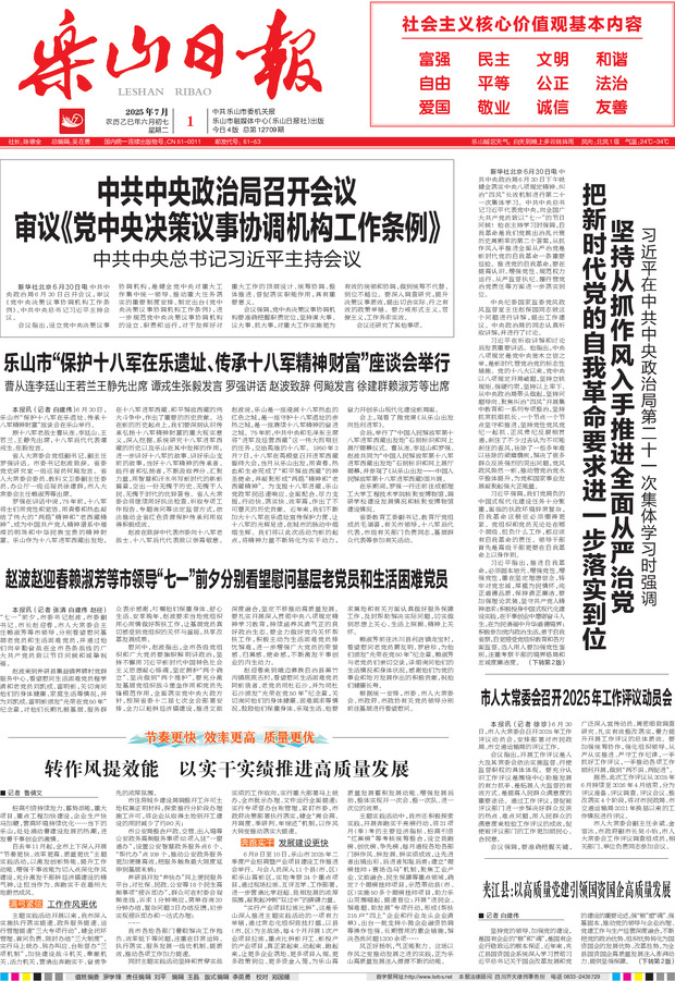 中共中央政治局召开会议 审议《党中央决策议事协调机构工作条例》 乐山市“保护十八军在乐遗址、传承十八军精神财富”座谈会举行 赵波赵迎春赖淑芳等市领导“七一”前夕分别看望慰问基层老党员和生活困难党员 转作风提效能 以实干实绩推进高质量发展 坚持从抓作风入手推进全面从严治党 把新时代党的自我革命要求进一步落实到位 市人大常委会召开2025年工作评议动员会 夹江县:以高质量党建引领国资国企高质量发展